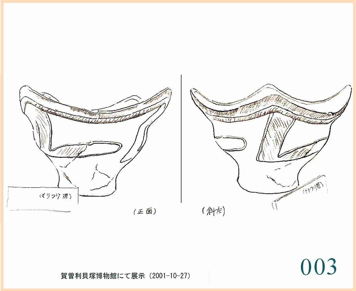 034 上からのぞくと底の部分も見える。実際に出土した部分は底と側面の一部らしい。全体の4分の1強か。丸い器は側面を下っていったん絞り込まれ、再び少しふくらんでいる。それで二重の器に見える。添えられた文に、「…テレビやSF映画でおなじみのUF0によく似た形をしてい(る)…」とある。