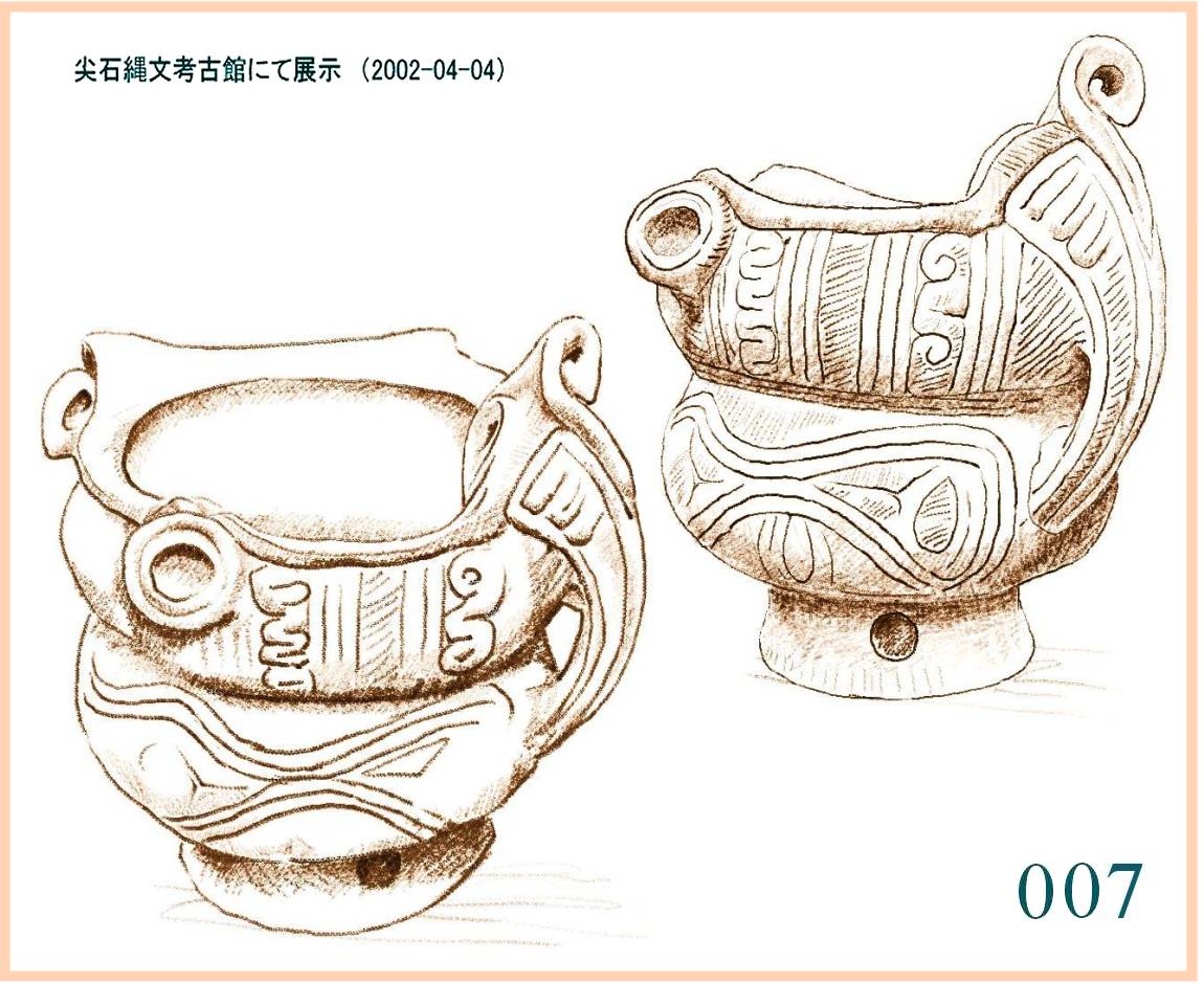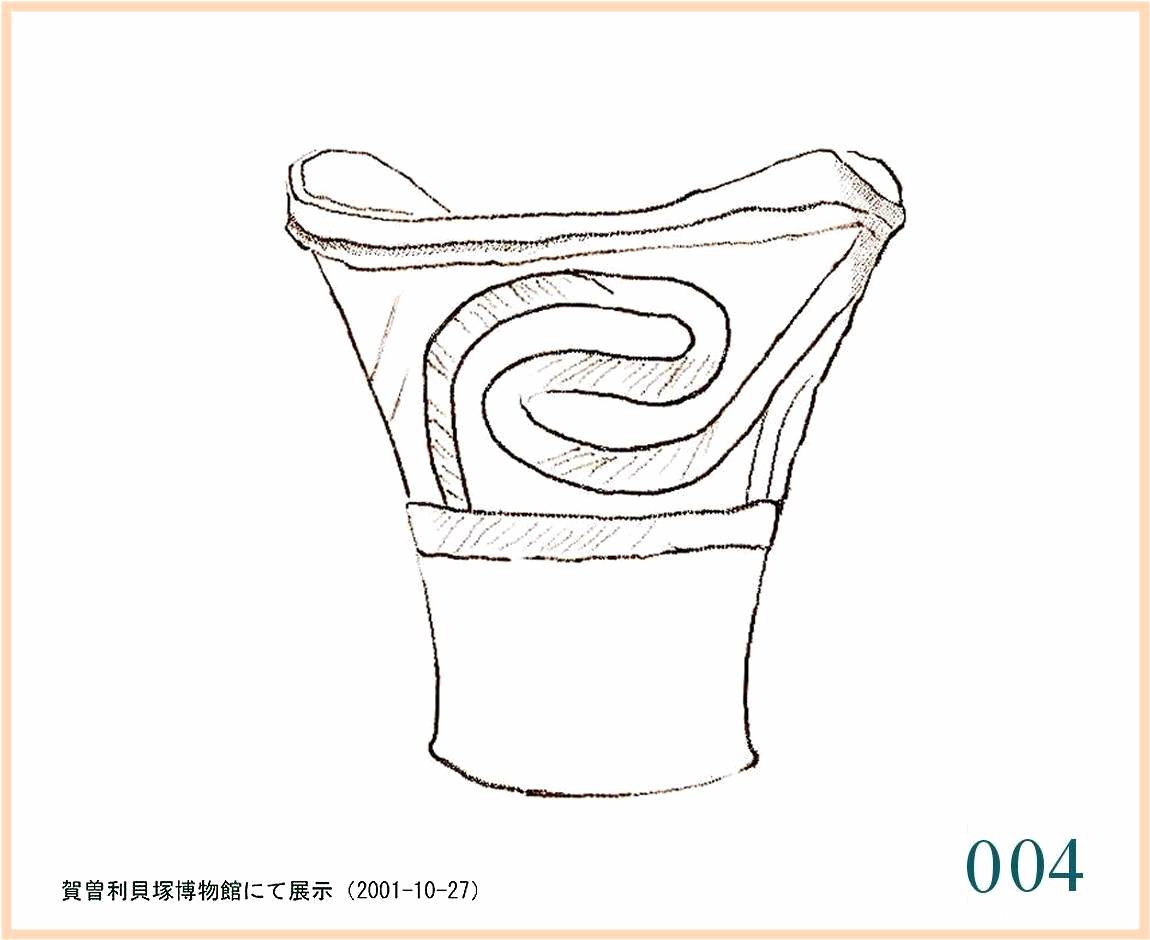 007このデザインは、ある不思議なまとまりを見せる。外側にカップの取っ手に似た突起がある。しかし、かなり大きめで指になじむ形でもないから現在のカップのような持ち方はできない。反対側下部を片方の手で支えて両手で持ち上げることになる。取っ手の上部は上へ三角にふくらみ、内側に向いて大きく穴があく。穴な深いようだが抜けるところはない。取っ手の上ではさらに面を巻いて輪を見せる。容器そのものは丸くふくらんだ形の二段重ねだ。この容器全体がいかにも立体的表現に満ちている。