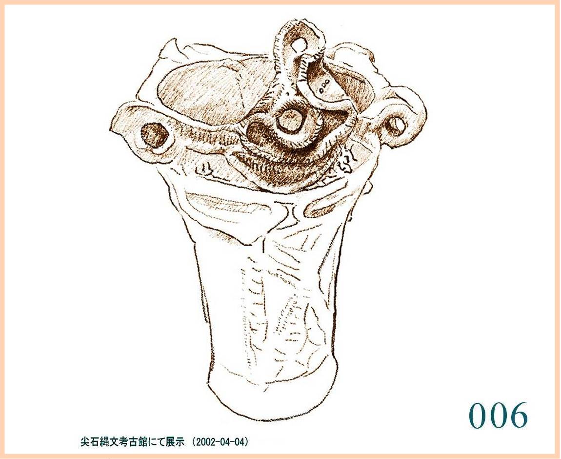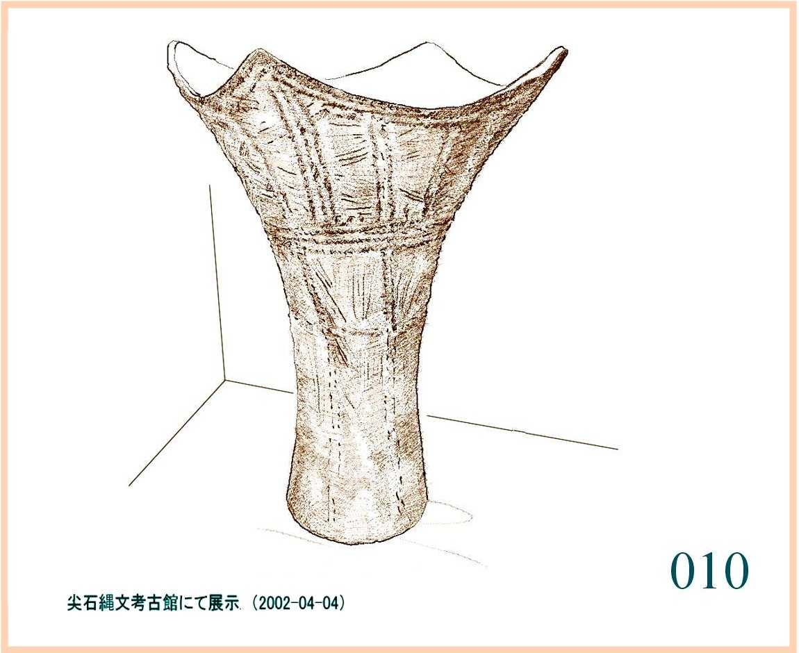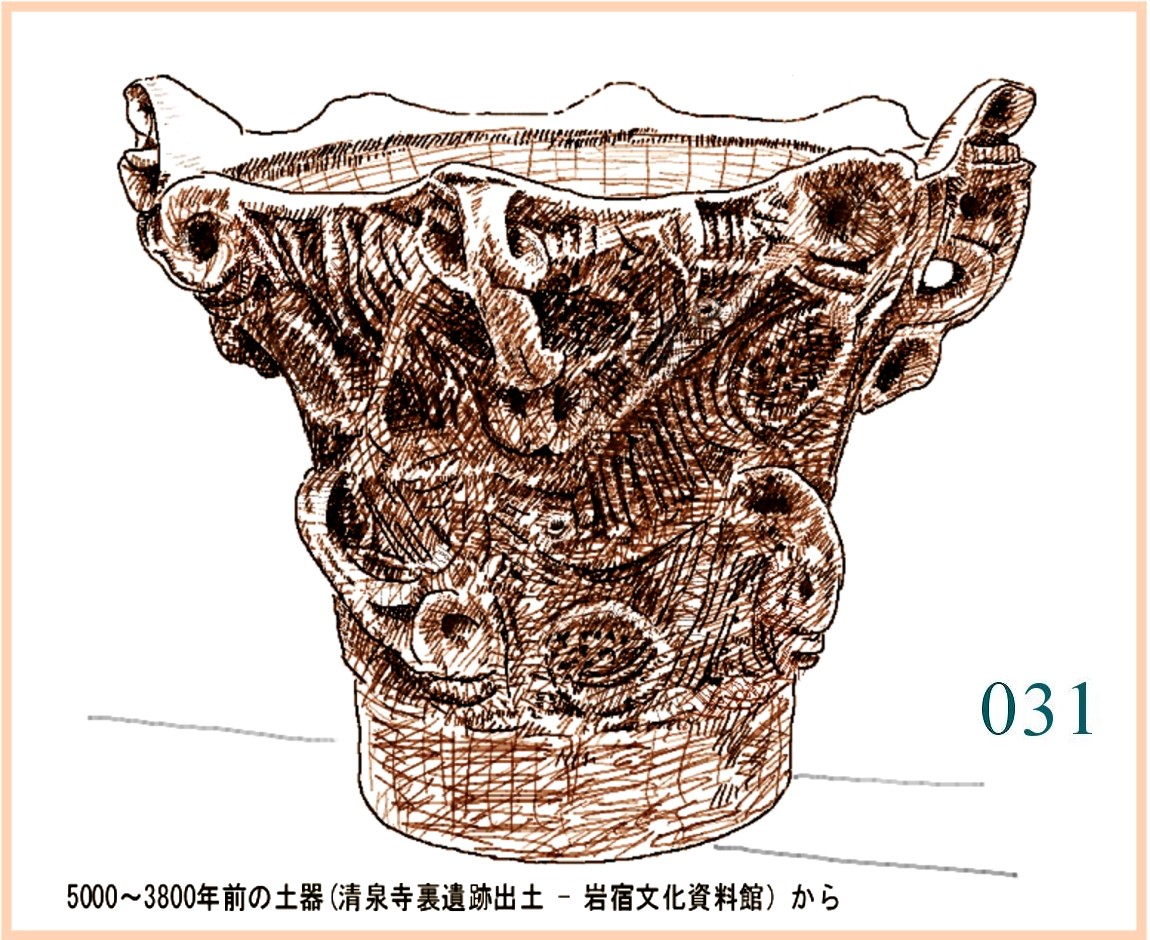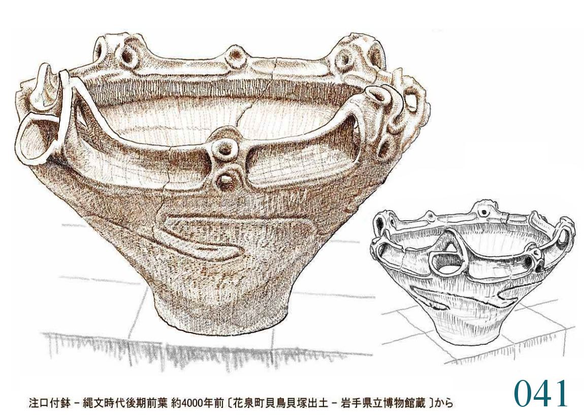022 文様は随意に引かれているが形の囲み方は平面的。特徴は全体の形の優美にある。縄文の終わりに、文様は固い形式に流れ自由に躍動するかたちが少なくなる。しかしなぜか、容器の外形は洗練された感性を感じさせるものが多い。…。口はやや狭いが全体の形から見ればこれがちょうどよい大きさだ。内部の細工はどうしたのだろう。小さめの手を手首まで入れても思うようには動かせないはず。現代の陶工が使うように適当な形に加工した木片が使われたかもしれない。