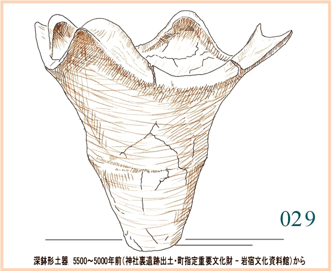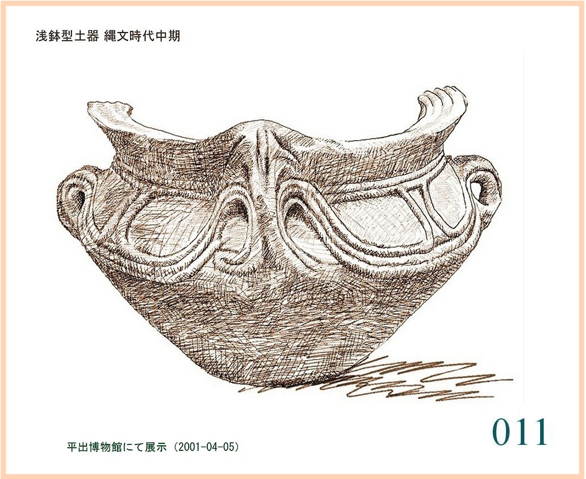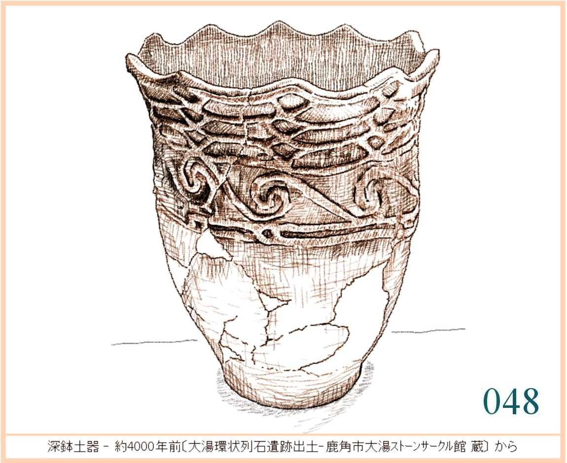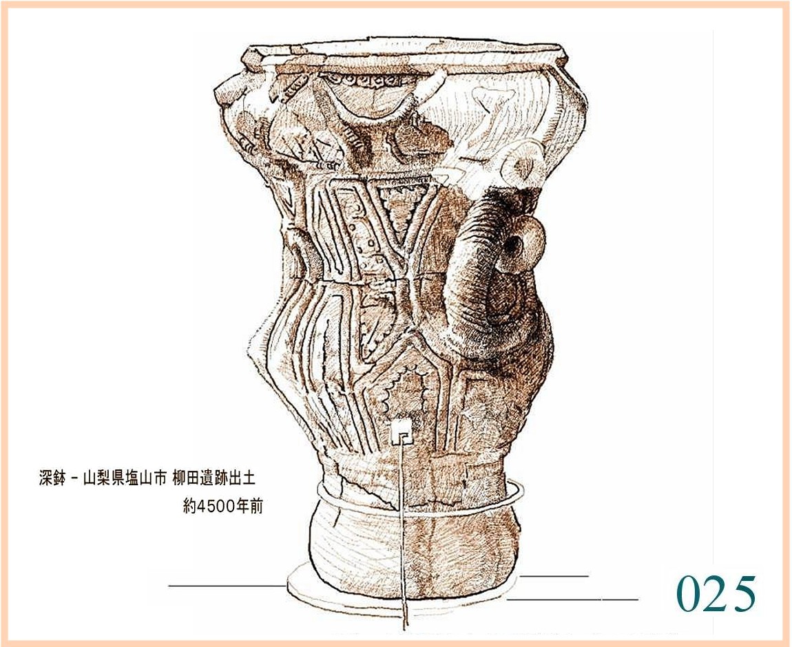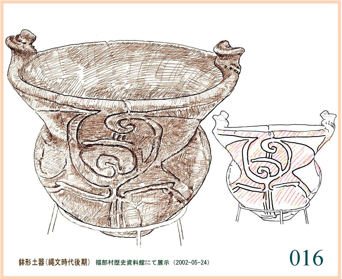 022 文様は随意に引かれているが形の囲み方は平面的。特徴は全体の形の優美にある。縄文の終わりに、文様は固い形式に流れ自由に躍動するかたちが少なくなる。しかしなぜか、容器の外形は洗練された感性を感じさせるものが多い。…。口はやや狭いが全体の形から見ればこれがちょうどよい大きさだ。内部の細工はどうしたのだろう。小さめの手を手首まで入れても思うようには動かせないはず。現代の陶工が使うように適当な形に加工した木片が使われたかもしれない。