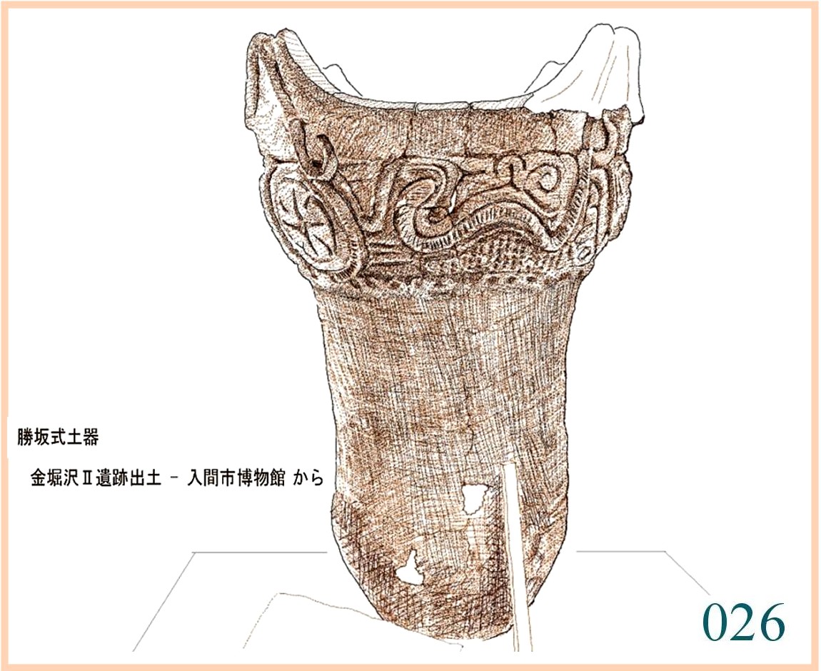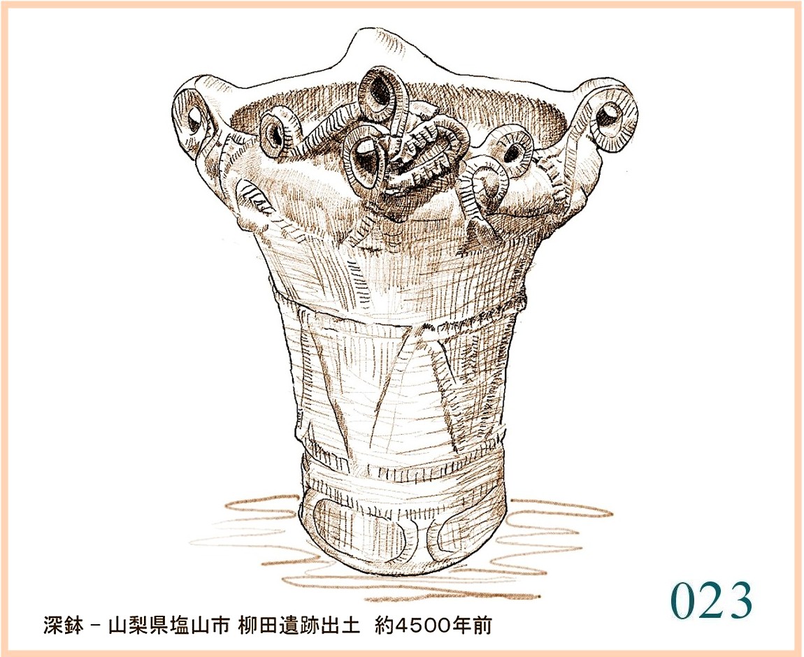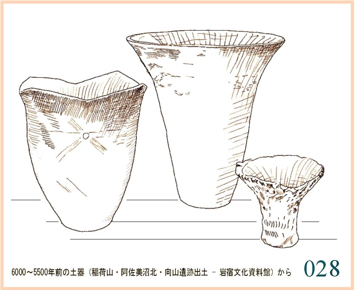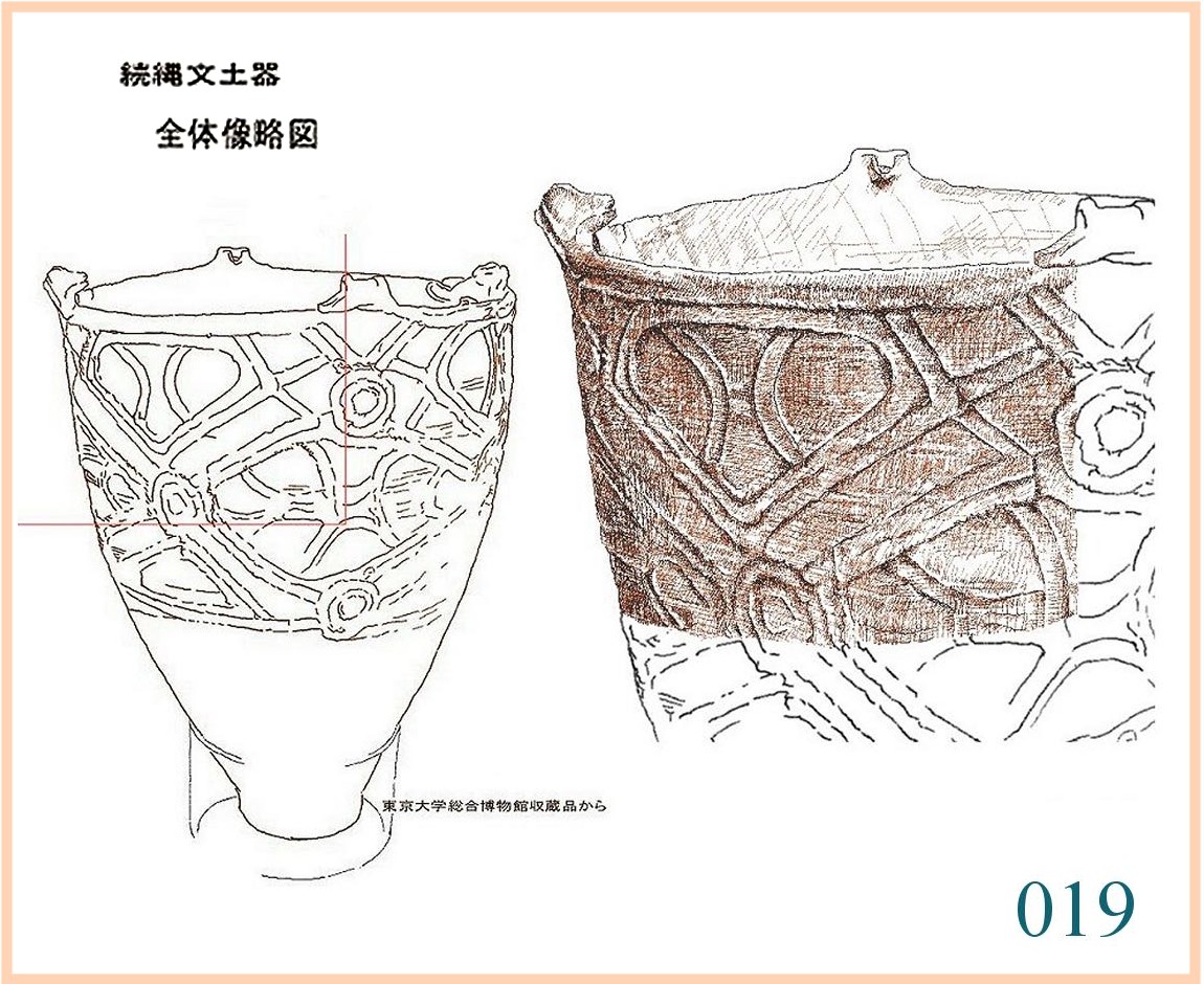 022 文様は随意に引かれているが形の囲み方は平面的。特徴は全体の形の優美にある。縄文の終わりに、文様は固い形式に流れ自由に躍動するかたちが少なくなる。しかしなぜか、容器の外形は洗練された感性を感じさせるものが多い。…。口はやや狭いが全体の形から見ればこれがちょうどよい大きさだ。内部の細工はどうしたのだろう。小さめの手を手首まで入れても思うようには動かせないはず。現代の陶工が使うように適当な形に加工した木片が使われたかもしれない。