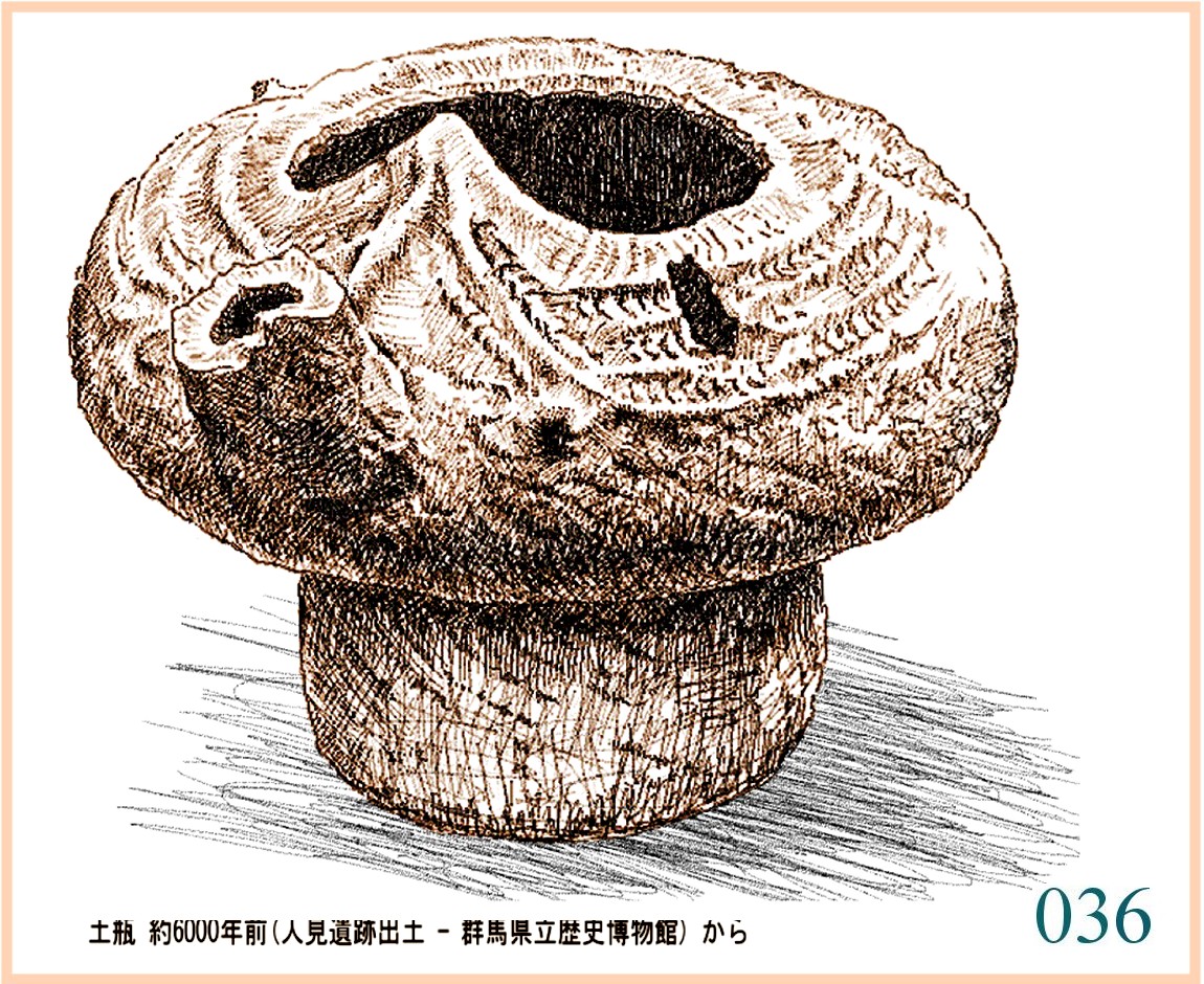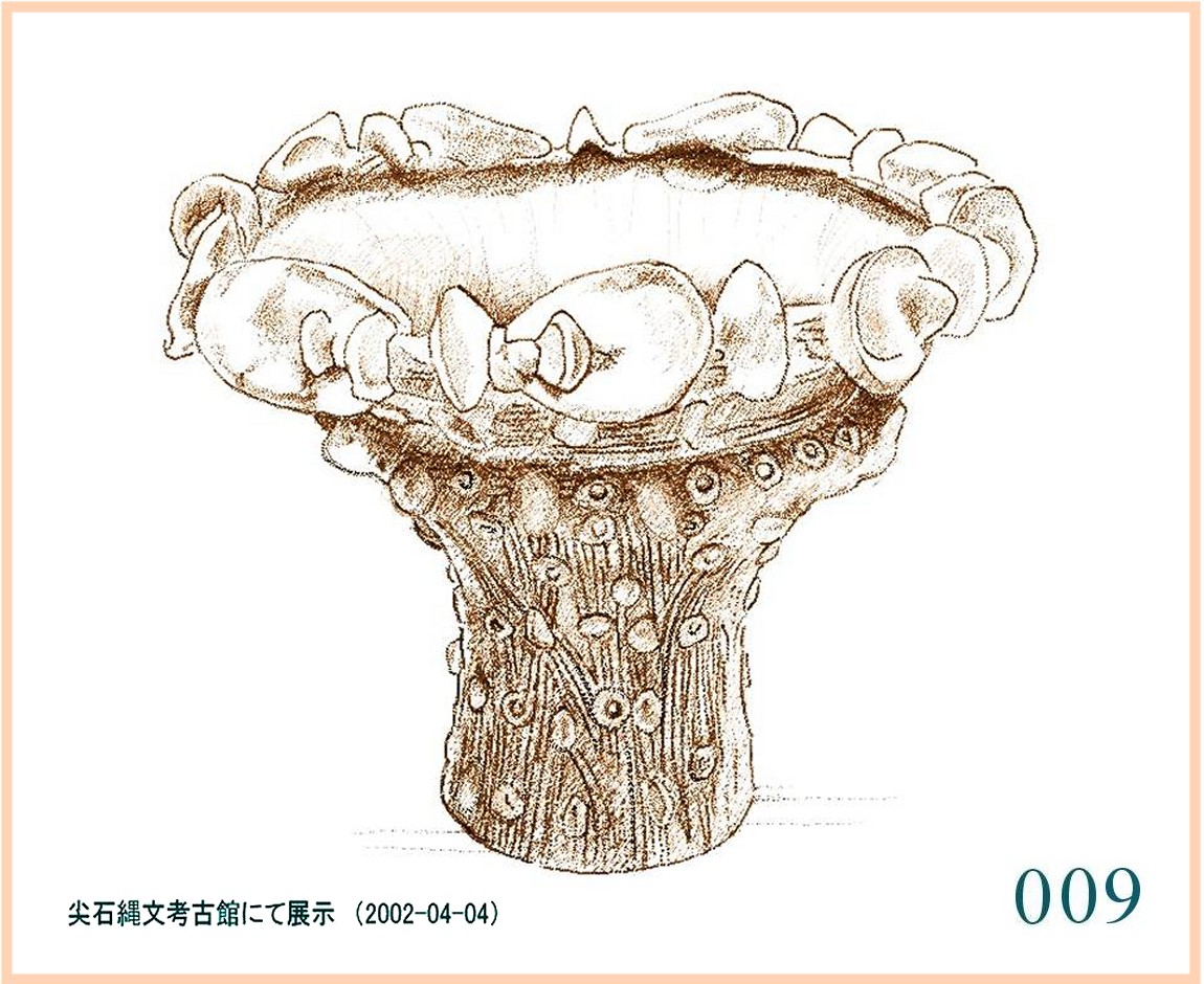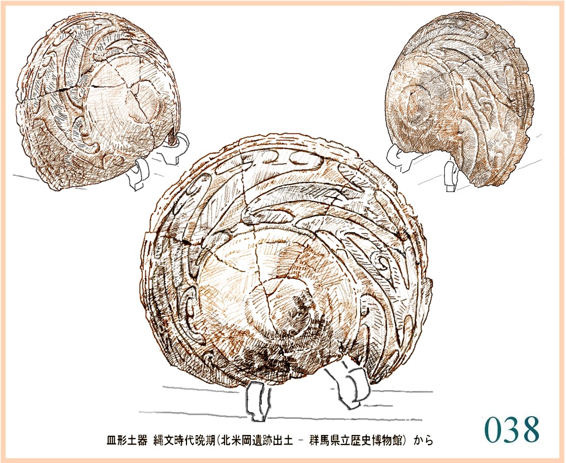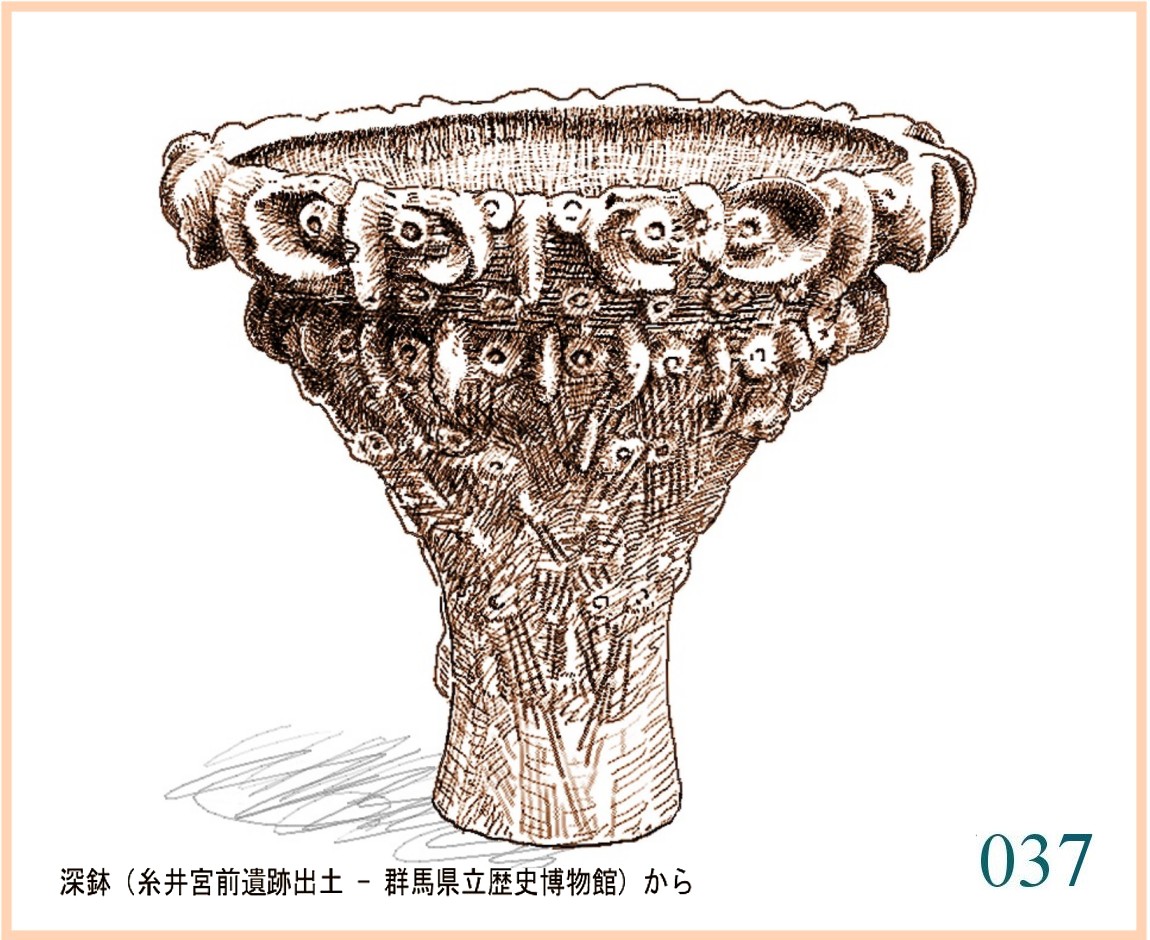 037 これは、尖石で見た土器をすぐ思い出す「貝殻状突起付き深鉢」。粘土をにぎやかに貼り付けた形状と側面に刻まれる線条という共通点。この形は広範囲に行われていたのだ。…。表現に少しずつ違いがあるが、細く絞った胴から急に上に広がるという基本的なかたちは同じだ。広い範囲で同じ目的に使われていたにちがいない。出土するのはほんの一部だろうから、一定の期間各地で作られたものを合わせたら非常に多い数ということだ。こういう容器には、いったい何を入れるのだろう。長くてよくしなうもの。それをいっぱい入れて広げておくか。