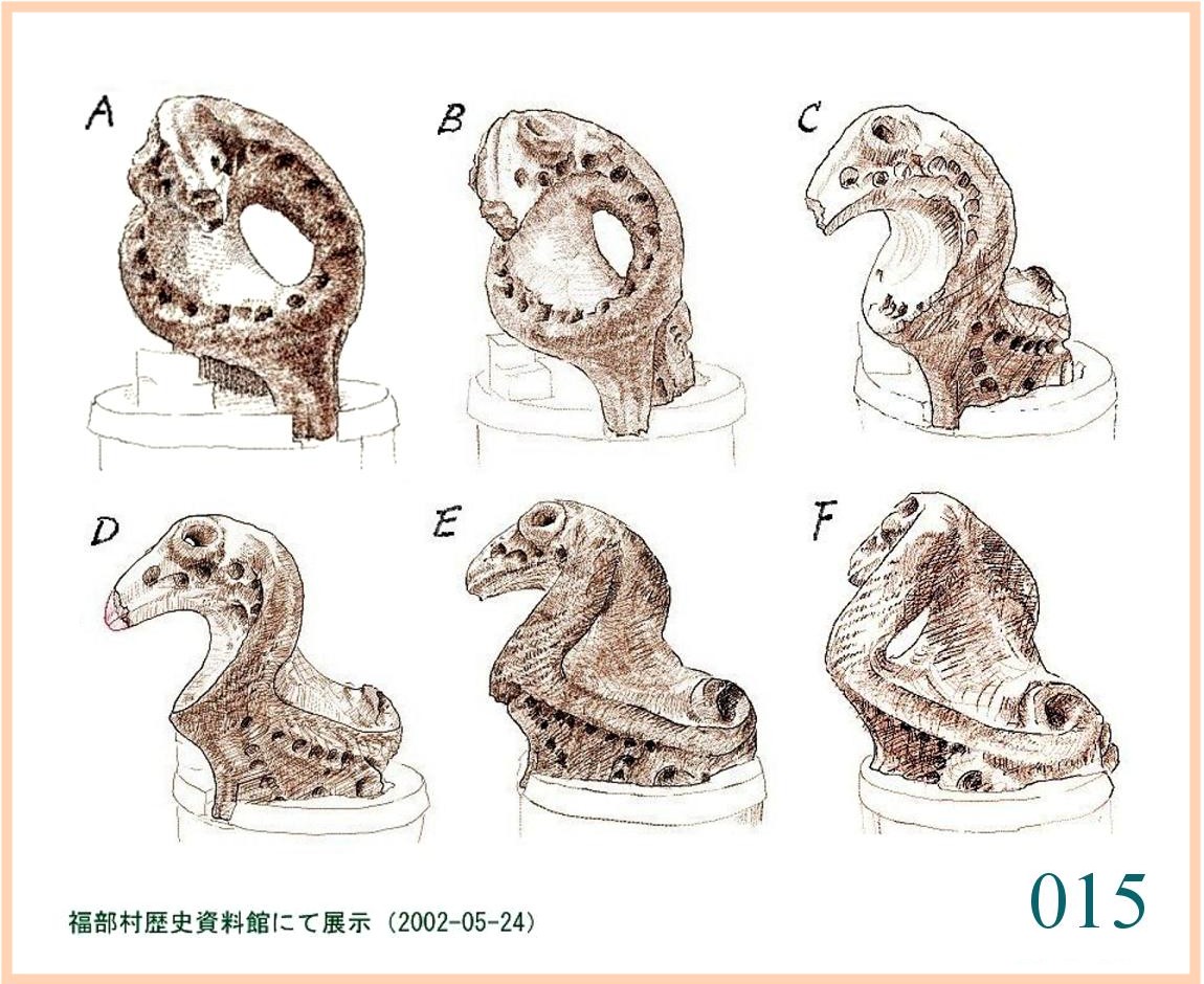 015 こうして図に表して並べると、見る角度によってそれぞれ違った感じを受ける。D図では、口先に当たる部分が明らかに欠けているので、いろいろな角度から見て最もありそうな形を補ってみた。また、ここで見られるように上の部分に貫通した穴がある。この周囲を盛り上げた穴のせいか、頭部は蛇のようには見えない。口先を補ったためもあるが、側面から見たC、E図では、たとえ補わなくてもその感じは強い。首をかしげた鳥かトカゲの仲間のようにも見える。蛇の顔に見えるのは顔に当たる部分を正面から見たA図だ。この場合は、貫通した穴は用を為さず、一番手前の穴が目のように見える。しかも、きちんと両側にある。この図で口先を補っても同じように蛇の顔に見えると思う。頭部の感じだけではなく、向かって右から左へ曲がりくねって後方へ消える胴体の感じも蛇を思わせる。それを強調するかのように穴が並んでいる。作り手は周囲いくつかの視点で楽しんだ。