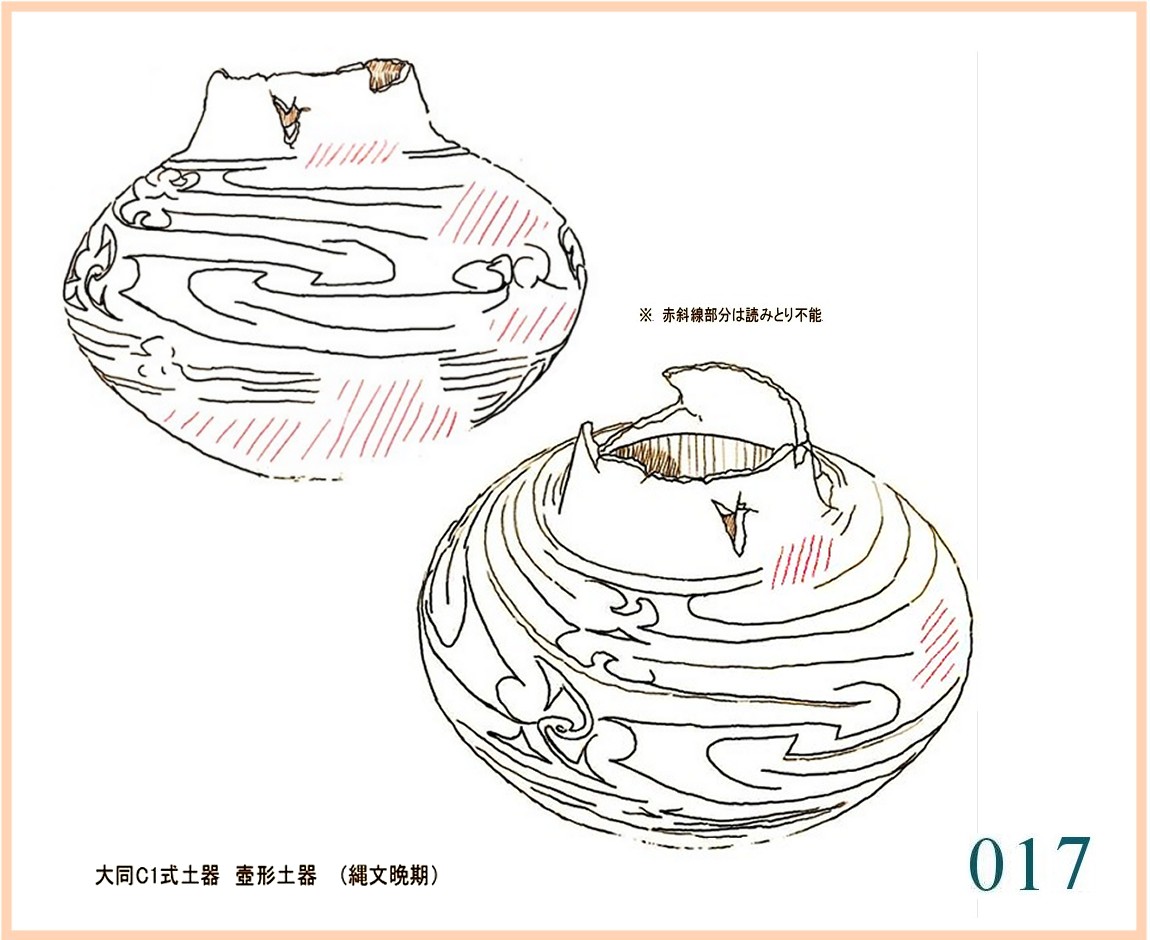 016 このような、いかにも絵画的な紋様に出会う。この手足のような図を見たらすぐにこれは人だといいたくなるだろう。容器は上下に分かれて上の三分の二は広く開いている。この部分がほとんど黒くなっているのは炎によるすすだろうか。もしそうなら、胴のくびれも中は広いので、実用的な炊事道具といえる。少し小さい。紋様の続き具合を見ると確かに人物様の部分の集中度は高い。…描線そのものは不規則に流れて方向を変える。けれども、たいていはどこまでも追うことが出来る。