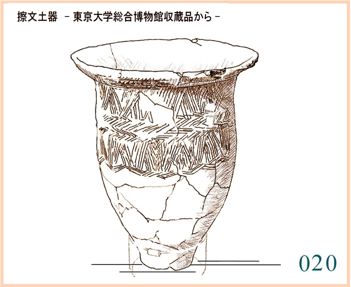 020 擦文土器を見た。鉢の上半分には細かく並べた線が一面に刻まれる。折り返すように並んだ数本の線は小さな面となり、V字形に組み合わせた2枚の板のように見える。立体的なイメージ。また、櫛の歯状のもので折り返した線にも見える。しかし、実際には本数や線の間隔は正しい「折り返し」になっていない。もし、始まりが櫛の歯状の道具だったとしたら、なぜその効率のよい道具を捨てたのだろうか。
