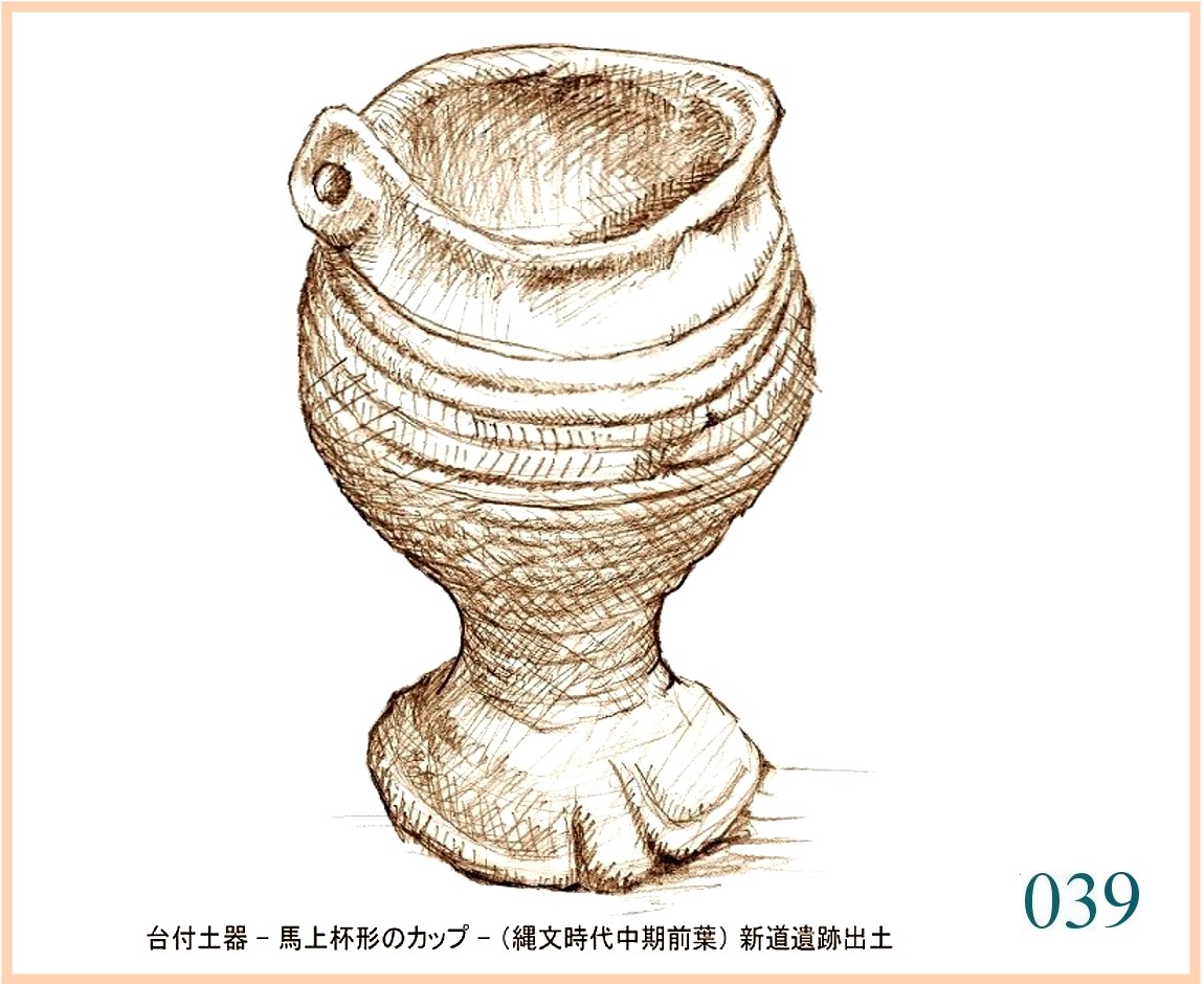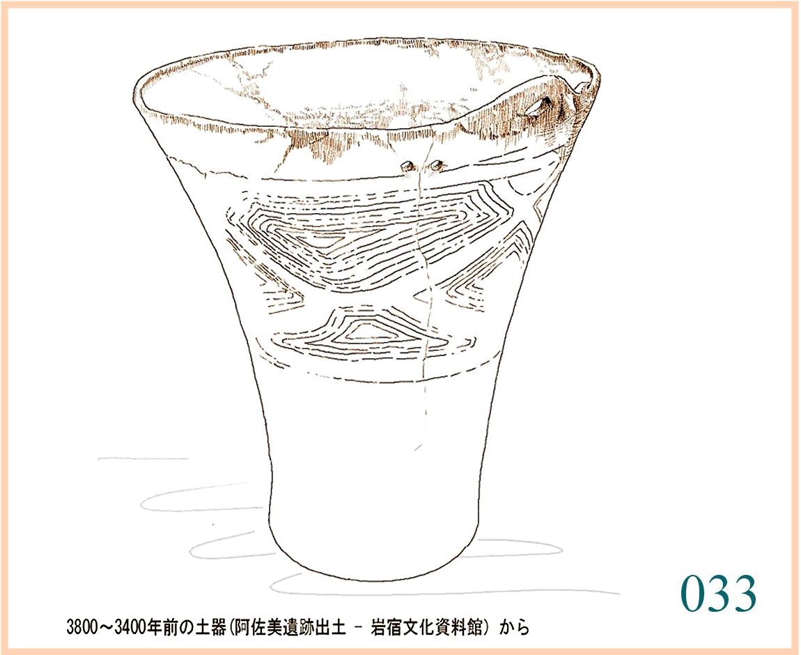 032 これはまたかわって、優しく端正な姿。帯を締めた貴公子といったところ。…。帯の上で左に出た取っ手様のものは右側にもある。取っ手としては小さすぎる。口辺の枠の下に規則正しく並んだ半円は、両端から垂れ下がる紐や幕を連想させる。…。…。口辺の上には向かい合って2カ所の峰がゆるやかに立つ。ただし、片方は土器の再生時に補足されたものらしい。帯は腰高に締められる。その下の輪郭線はわずかなふくらみで下に向かい、全体を見事にかたちづくる。