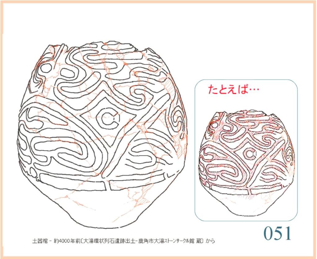 078 胴に刻まれた文様の表現には規則的な繰り返しがあまりないようだ。比較的変化に富む面があって、そこから左右へ目を移していくと次第に2本の横線が目立ってくる。その上下には中で広がったくぼみや閉じた三角の隙間が所々にある。真後ろは分からないが、見える限りはこのようだ。左の図の変化の多い面は眺めているとおもしろい。上からの逆S字状の流れが変化を作り出している。左右から来た流れがそれぞれ分岐してS字に合流する。左右から流れて来るもう1本は途絶えて隙間ができる。そこをそれぞれ上下から生まれ出た「かたち」が埋める。Sの中心で点対称を構成している。配置は対称だが各部分のかたちには変化があって堅苦しさはない。