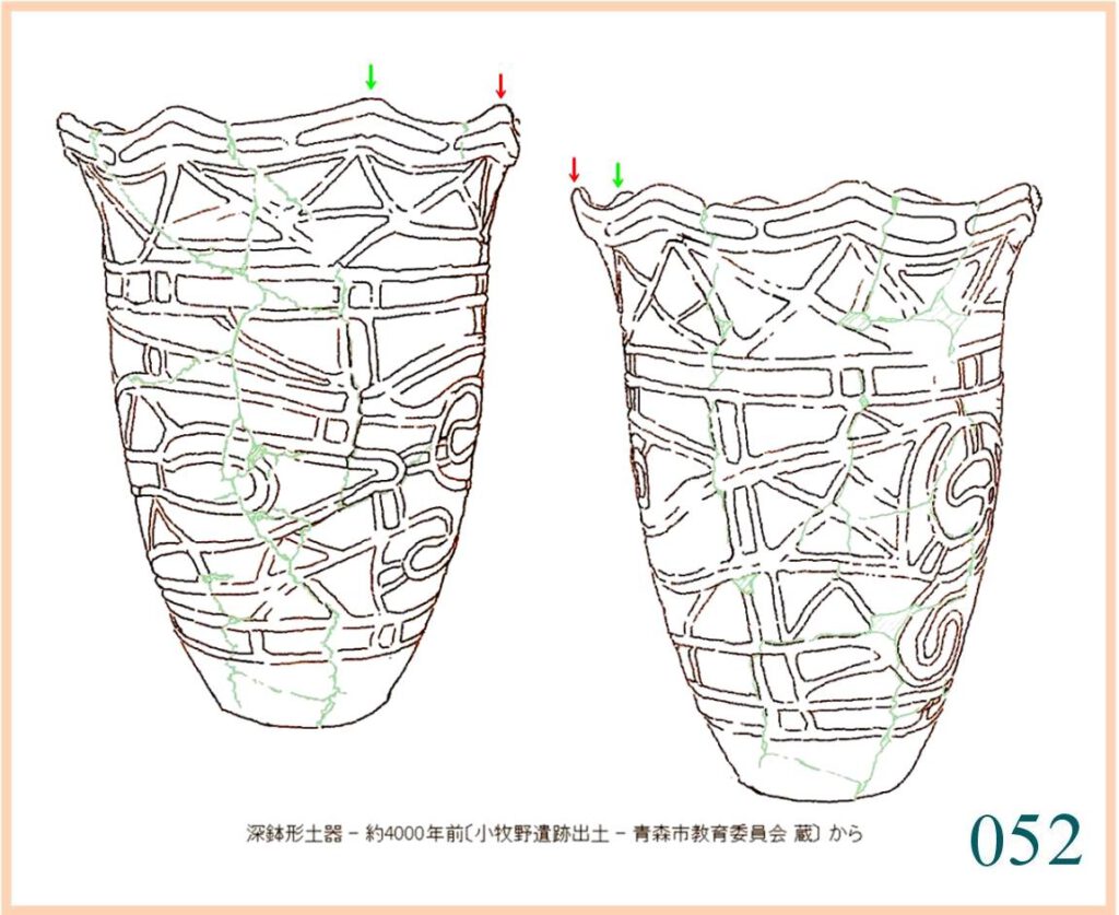 055 上部の周囲と内側には赤いものがかなり残っている。下の方にも所々赤い点が小さく残っている。…。赤い点は、盛り上がった線のすぐそばに多い。全面に塗られていたかどうか分からない。…。縄文では、よく表面に縄目や刻んだ斜線で面を区別しているから、ここで漆を使う場合にも文様の色分けをしたかもしれない。下全面に隙間なく描かれた線は、やや機械的で固い感じだ。いつもの水平な線を開いたり閉じたりする文様がくり返される。