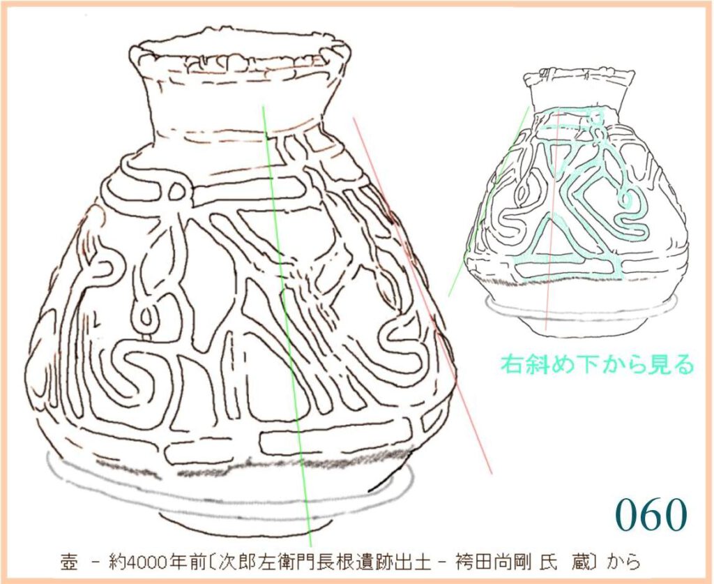 060 このかたちの側面は斜め上から眺めるのに適している。作り手もそんなふうに見ながら粘土ひもを押しつけていったのだろう。そこに描かれる文様は、あるかたちの繰り返しだ。その一つの始まりと終わりがどこなのかは分からない。この文様の必要事項は作り手の頭の中に入っているらしい。が、実際には細部にこだわる様子はない。各部の大きさ、つながり方などはその場その場で適当に処理しているように見える。多分、彼にとって大切なのは、必ずしもここに見えている形ではなく頭の中にあるかたちの方なのだ。