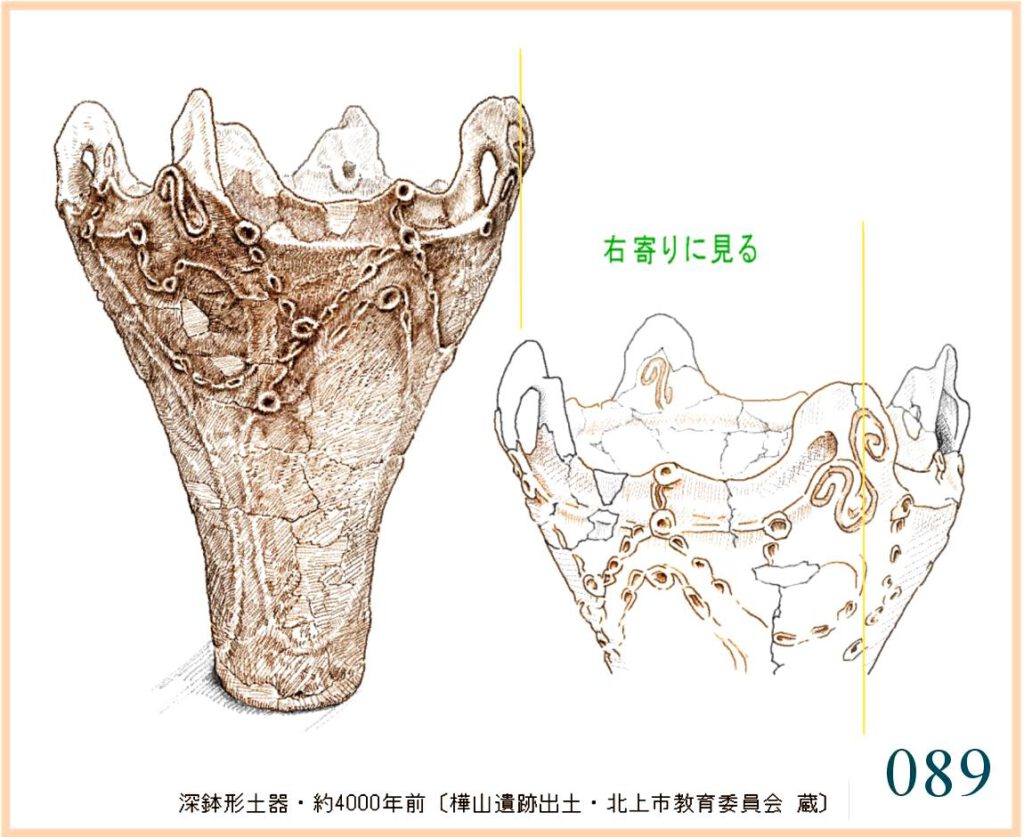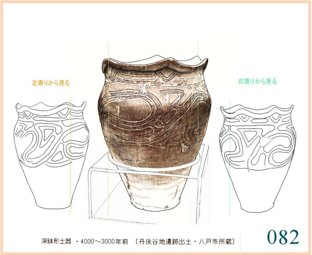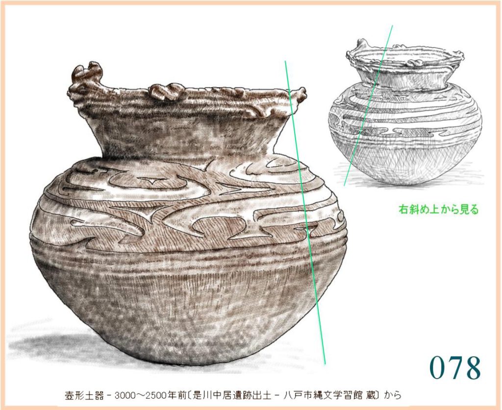 059 複製。表現がやや単調でひかえめなせいだろうか、この容器には外形と文様との不思議な調和を感じる。すでに、およそ1万年も前にこの形ができていて使われていたのだ。この容器を両脇に抱えて水などを運んだり、両手に持ってこれから火を焚く炉の中に立てたりする。手のひらでかたちの曲面に触れ、肌の感触を確かめる。…輪郭線の流れや器の肌はかならずこうでなくても容器として用は足せる。しかし、人々にとってはこの輪郭線とこの量感、この肌合いでなければならなかった。