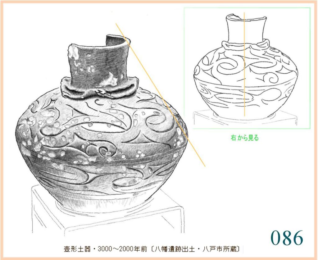 086 惜しいことに、表面が斑点状にはがれてしまった壺形土器。ていねいに描かれた文様は、縄文晩期の硬さを巧みに隠して大胆に渦巻き激しく流れて躍動的だ。それとも、この一面に散る斑点が見る者の眼をごまかしているのだろうか。こんなに、表面が部分部分で薄くはがれたのはなぜだろう。よく磨けるように、きめの細かい粘土を表面にだけ別に重ねたとか。