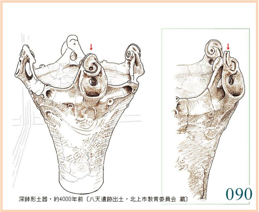 090 縄文土器の口辺には変わったかたちの突起がいろいろ乗っているが、この突起はこれまでになく不思議な形に組み合わされている。これは、動物の三半規管に近いいくつかの骨とか、複雑な姿に進化した貝類とかを思わせる。そのように意味ありげな形なのだ。面は反り返り湾曲して内側に滑り込み、面に挟まれた溝は回転していつの間にか外へ逃れ出る。