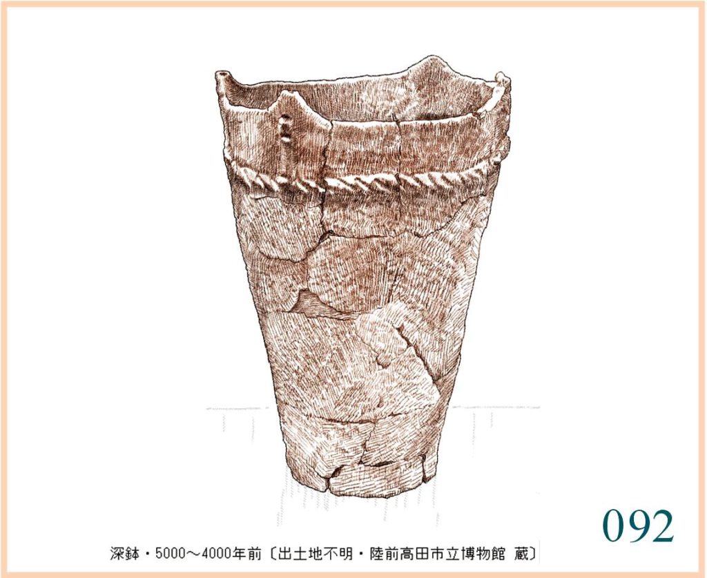 092 たがを締めた桶のような深鉢。そのような木製の桶があったはずはない。しかし、大きく割れた深鉢を竹か縄で締めてもう一度使うことはあったかもしれない。それにしてもこの姿は、まだついこの間まで使われていた底の深い桶によく似ている。