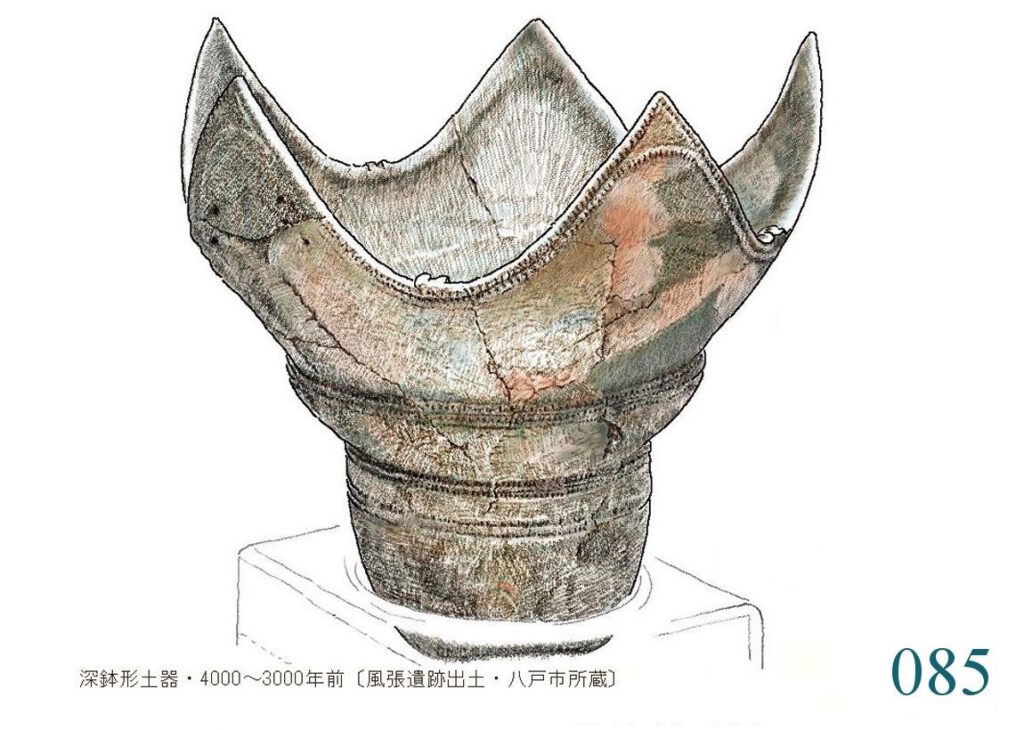 085 これは、頂点のかたちからいって「とんがり底の土器」と同じなかまだ。尖った5つの頂点は精いっぱい大きく広がり空間を受け取ろう、包みこもうとする。この土器は自らを上部のかたちで主張している。胴を締める2段の細い帯は上の花弁のような広がりを強調する。