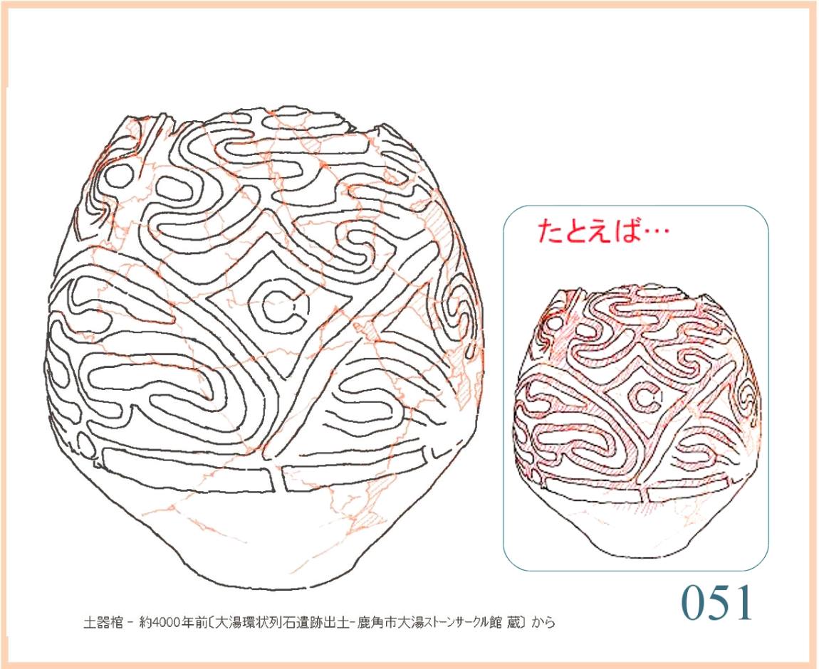 052 文様のほとんどは二本の線で明解に描かれる。まるで道を表した地図のようだが、たぶんそんなはずはない。けっして幾何文様でもない。道なりにできたS字を除けばどんな対称図形も見られない。道は坂を下ったり、迂回したり、S字型カーブを作って丸まったりする。分かれ道や上下の水平な線にぶつかって行き止まりになるのはあるが他の線をくぐるのはあまりない。…。この曲面の全てを二本線で構成しようとする強い意欲だけははっきりと伝わってくる。