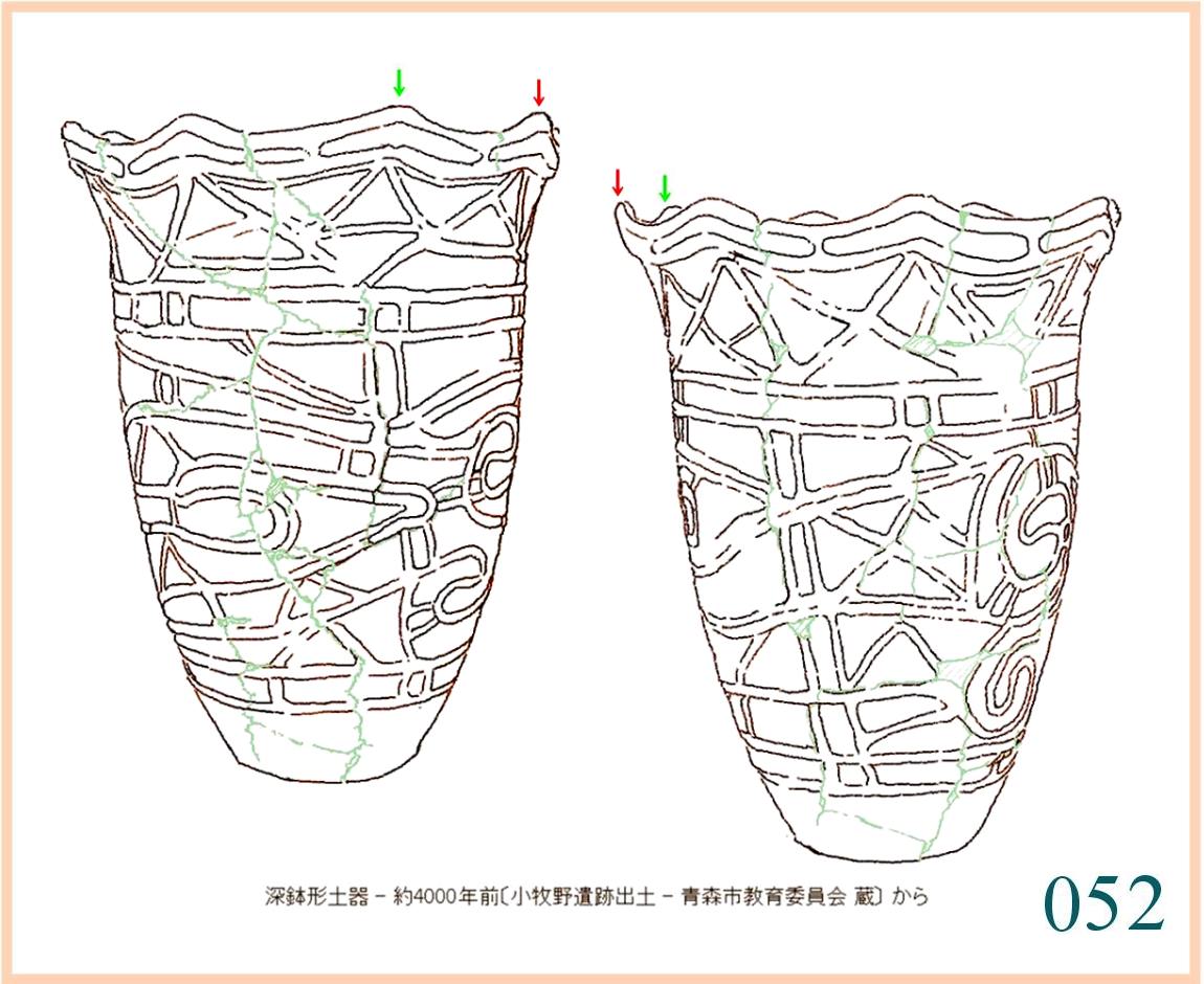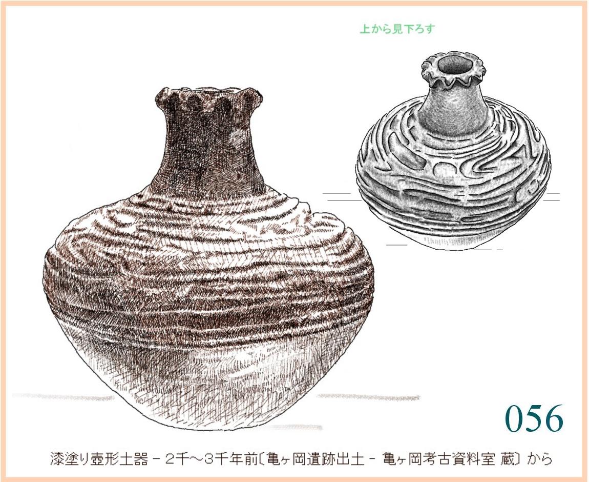 055 上部の周囲と内側には赤いものがかなり残っている。下の方にも所々赤い点が小さく残っている。…。赤い点は、盛り上がった線のすぐそばに多い。全面に塗られていたかどうか分からない。…。縄文では、よく表面に縄目や刻んだ斜線で面を区別しているから、ここで漆を使う場合にも文様の色分けをしたかもしれない。下全面に隙間なく描かれた線は、やや機械的で固い感じだ。いつもの水平な線を開いたり閉じたりする文様がくり返される。