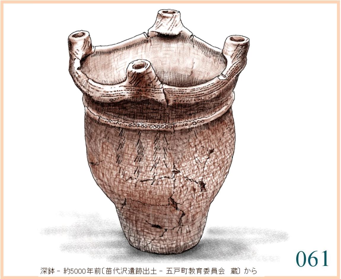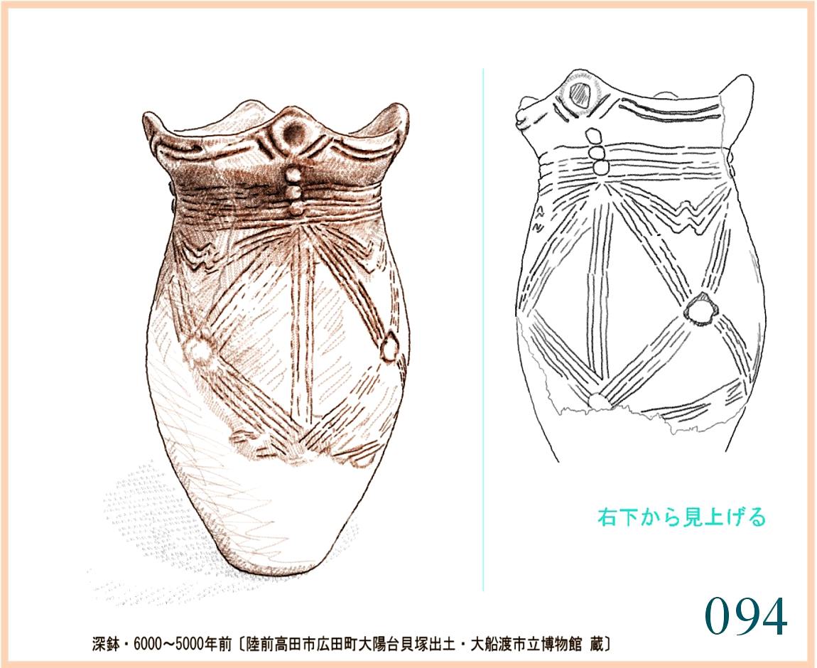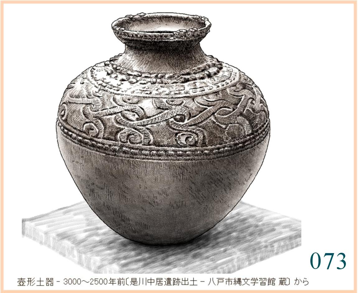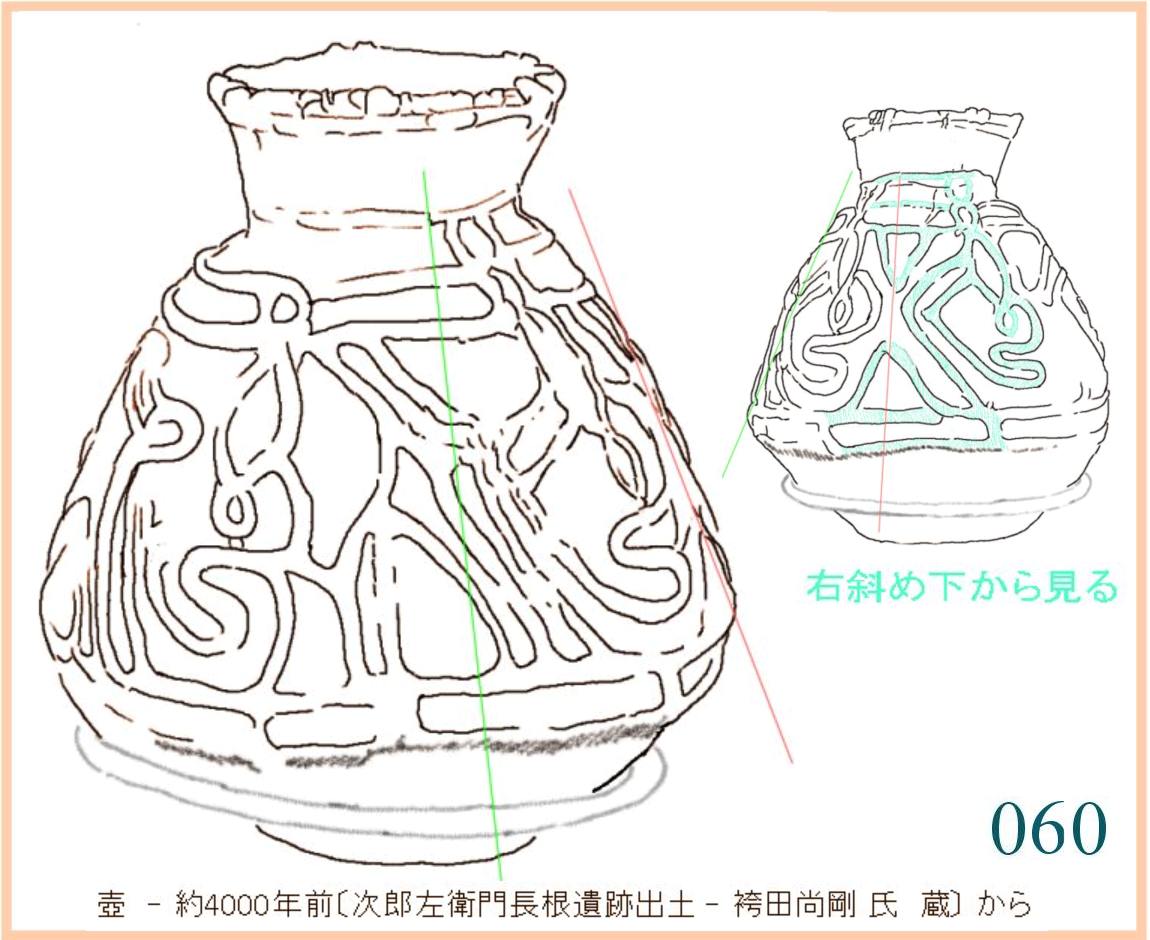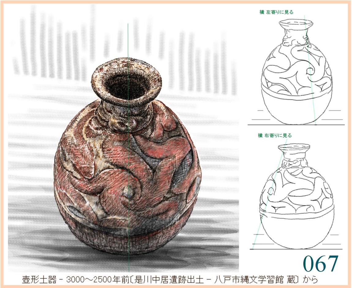 059 複製。表現がやや単調でひかえめなせいだろうか、この容器には外形と文様との不思議な調和を感じる。すでに、およそ1万年も前にこの形ができていて使われていたのだ。この容器を両脇に抱えて水などを運んだり、両手に持ってこれから火を焚く炉の中に立てたりする。手のひらでかたちの曲面に触れ、肌の感触を確かめる。…輪郭線の流れや器の肌はかならずこうでなくても容器として用は足せる。しかし、人々にとってはこの輪郭線とこの量感、この肌合いでなければならなかった。