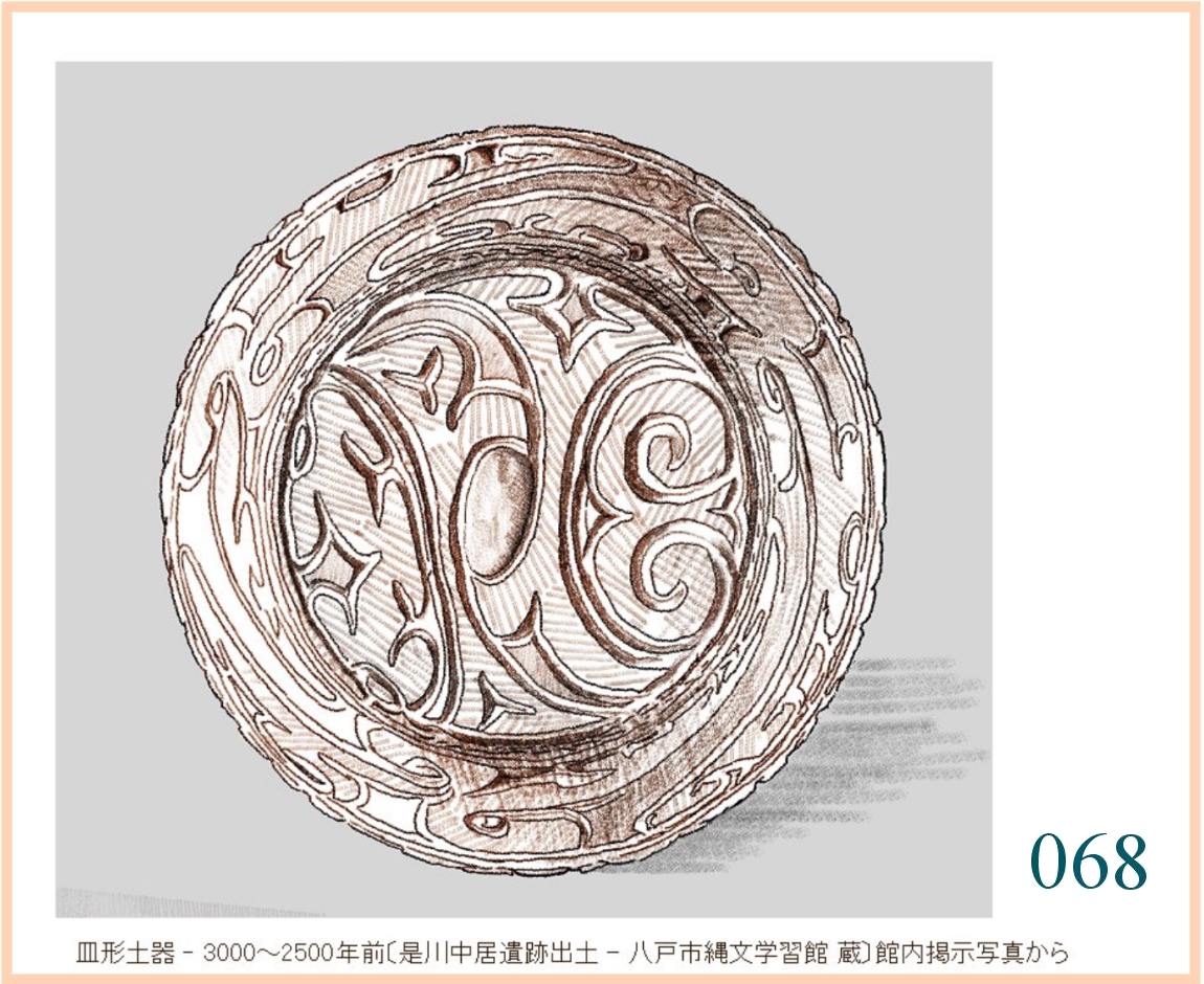 068 底の部分は広く、そこにもふつうにはない文様が刻まれている。この皿は、当時でも裏返して見ることがよくあったのだ。底の文様は、大まかに点対称をなす。けれども、その両側の図は少しも似ていなくて、対称図形を完成する気はないようだ。側面では同じ模様が3つ連なって描かれる。皿の縁から出た線が右へ長く伸ばされて底の稜線に降りる。その他の図形はそれに繋がる飾りのように見える。くり返されるかたちは、楽しんで面を埋めているにすぎないのか、あるいは何かの想いを確実に刻みつけようとしているのか。