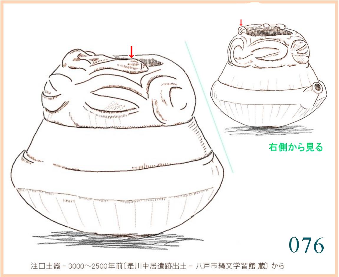 069 この土器は2つの部分からできているように見える。注ぎ口の付いた浅い皿のような容器と、その広い面を高く覆うもの。かぶせて隠そうとするのか守ろうとするのか分からないけれども、中身を大事にしたいのは分かる。この形になる前は、縁の一部をへこませただけの注ぎ口をした皿だったのかもしれない。これと香炉形土器は同じ仲間のように見える。中身の大切さを示すために香炉の覆いを借りたのかもしれない。いずれにしても、注ぎ口がこのように下に位置する以上、上のようなことを思わずにはいられないのだ。