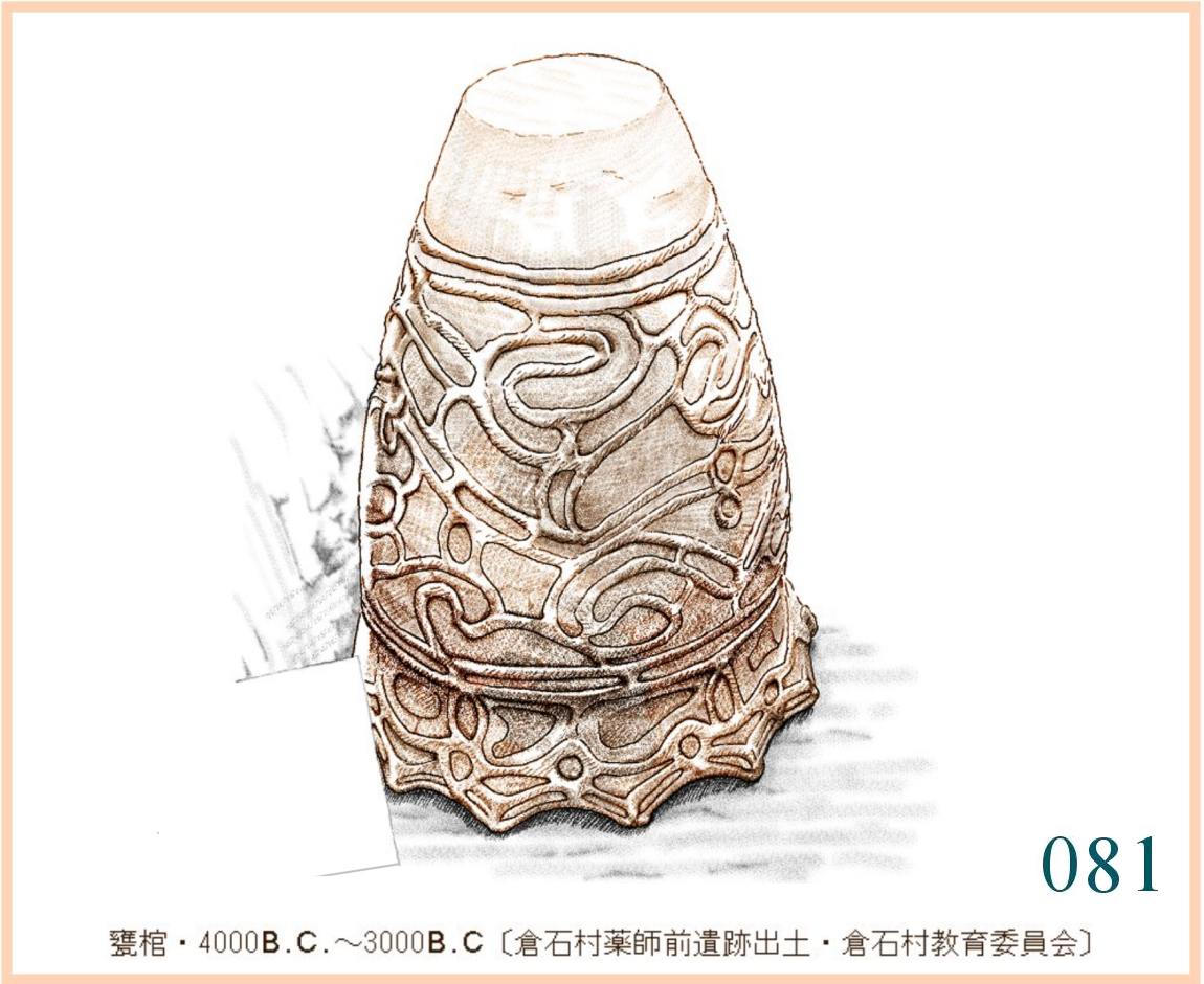 081側面低部は横のラインではっきりと区別し何も表さない。伏せて見せているからだろうか、花びらのように波打って開いた口辺から側面の大部分を装う文様は謎めいて、また、華やかでさえある。埋めてしまうこの棺もこんなにもていねいに心を込めて作られた。
