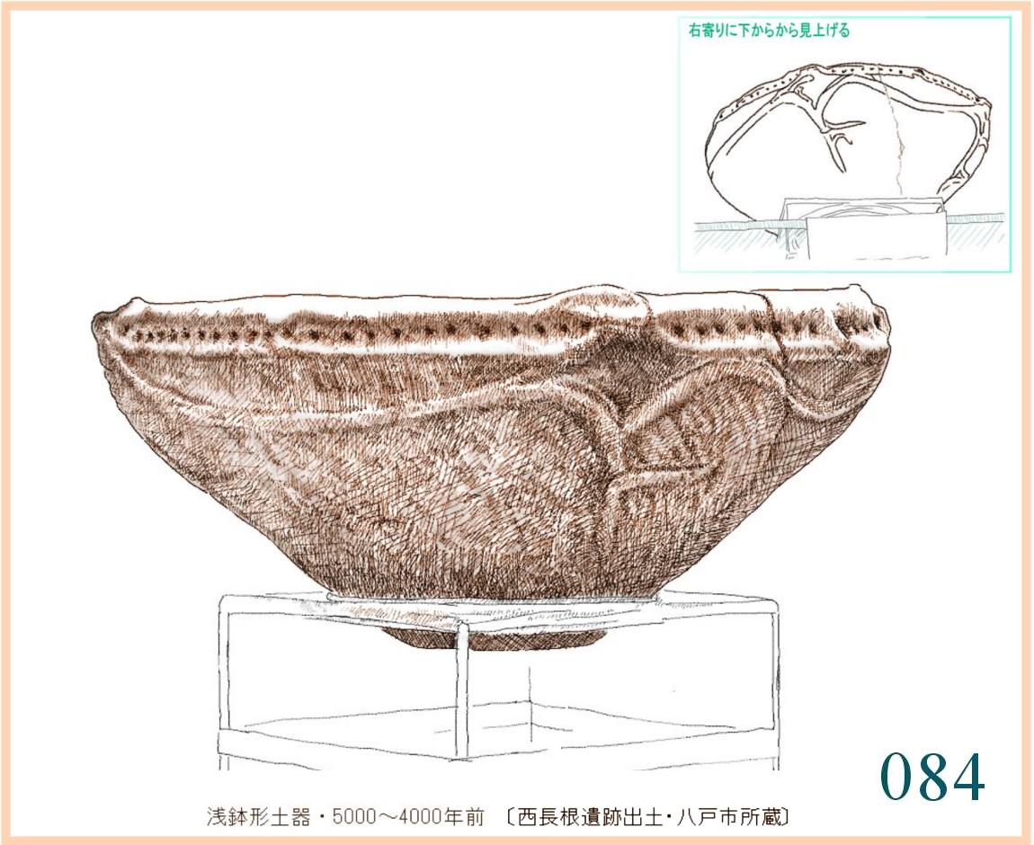 084 これは、まるで伸びやかな蔓性植物のイメージ。遠いむかしに、どのような感性がこうしたかたちをさえ浮かび上がらせるのか。たとえば、今となっては理解しがたい神懸かりの異常な感覚で生み出されるのか。しかし、このかたちに乱れはない。この浅鉢は静かに落ち着いた雰囲気で作られている。