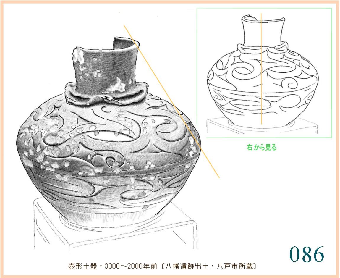 086 惜しいことに、表面が斑点状にはがれてしまった壺形土器。ていねいに描かれた文様は、縄文晩期の硬さを巧みに隠して大胆に渦巻き激しく流れて躍動的だ。それとも、この一面に散る斑点が見る者の眼をごまかしているのだろうか。こんなに、表面が部分部分で薄くはがれたのはなぜだろう。よく磨けるように、きめの細かい粘土を表面にだけ別に重ねたとか。